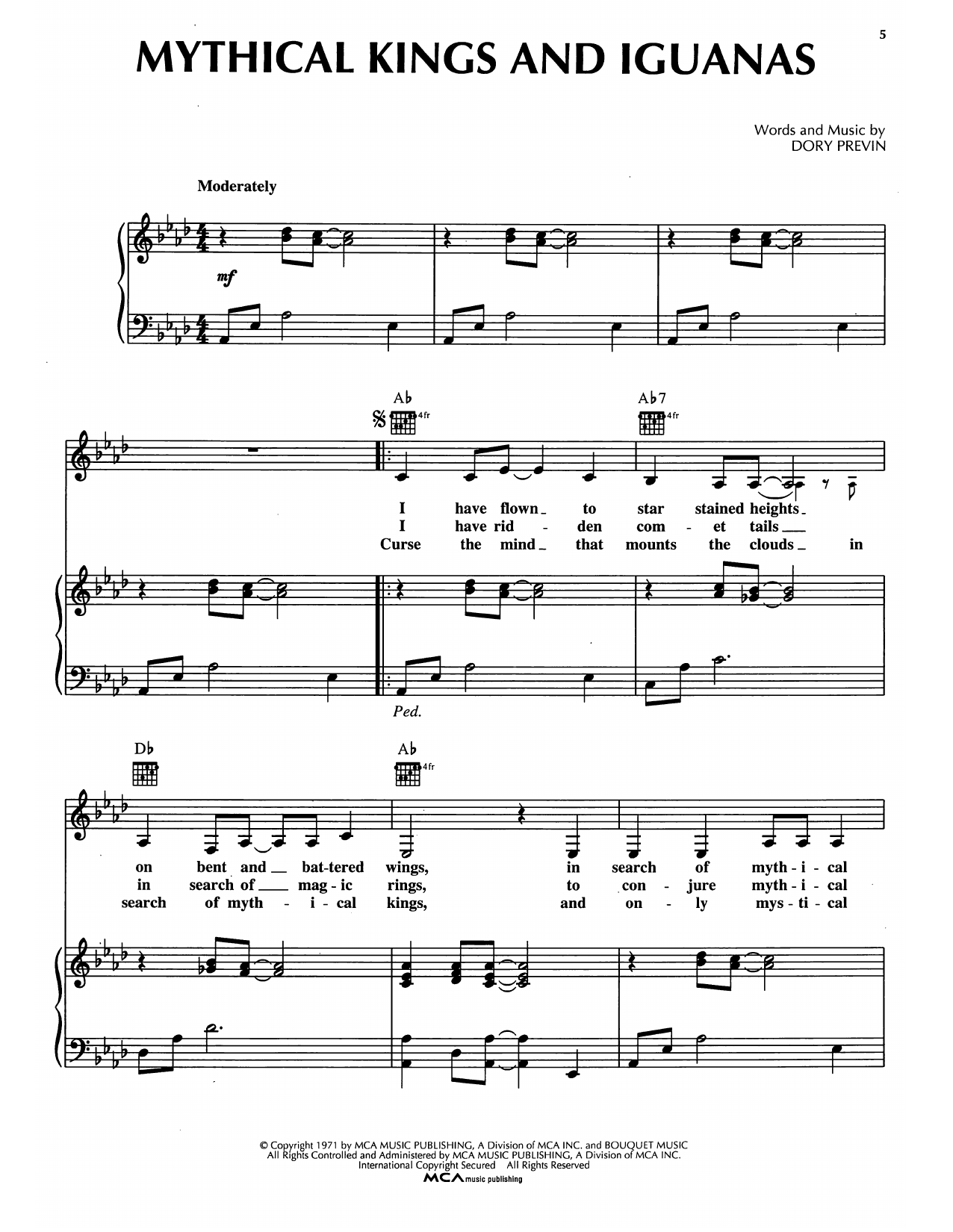 Download Dory Previn Mythical Kings And Iguanas sheet music, chords and digital score arranged for Piano, Vocal & Guitar Chords (Right-Hand Melody). This Pop score includes 5 page(s).